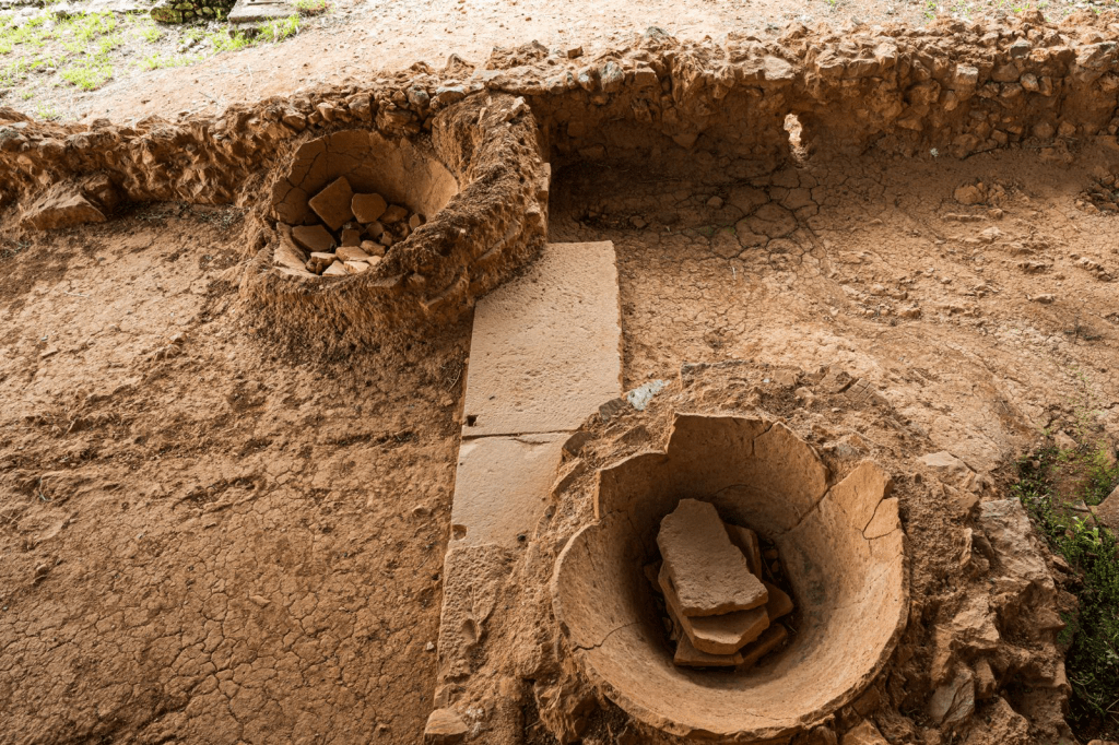 The cella olearia, a large open-air cellar, housed fifty dolia de fossa, large terracotta jars protected by a double lid half buried in the land. When olive oil was ready, it was poured into amphorae to be stored or transported on ships.