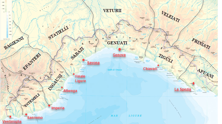 The consular roads built by the Romans, in particular Aurelia and Iulia Augusta (connecting the plains of the Po River valley to southern France), contributed to the Romanization of the region. Apart from Luni and Genoa, the main cities were Albingaunum (Albenga), Alba Docilia (Albisola Superiore), Albintimilium (Ventimiglia), Vada Sabatia (Vado Ligure), Segesta Tigolliorum (Sestri Levante).