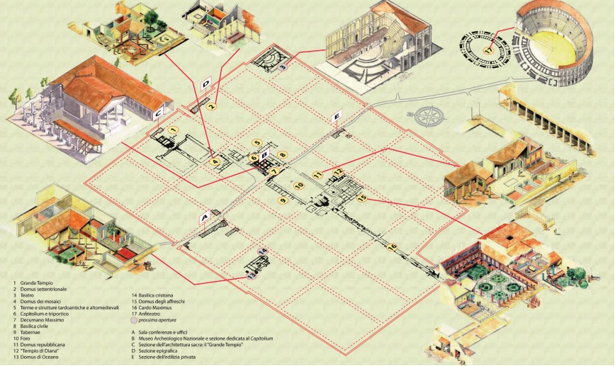 Amongst the most fascinating monuments there are the forum, the Capitolium, the Great Temple and many private residences with mosaics and frescoes, and the more recent Christian basilica.