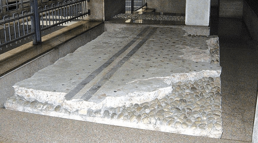 In the atrium of a house in Via Morigi 2 you can admire from the street the remains of a floor in beaten mortar with marble inserts from an elegant domus of the I century BC, one of the oldest of Mediolanum. It was part of an ancient quarter that was then incorporated in the Imperial Palace. The refined floor has a layer of lime and pressed stone flakes (cement), decorated on the surface with inserts of colored stones, framed along the edges by a frame with black and white tiles. In Via Morigi, 13 there is a room heated with a hypocaust system, with the support of pilae.