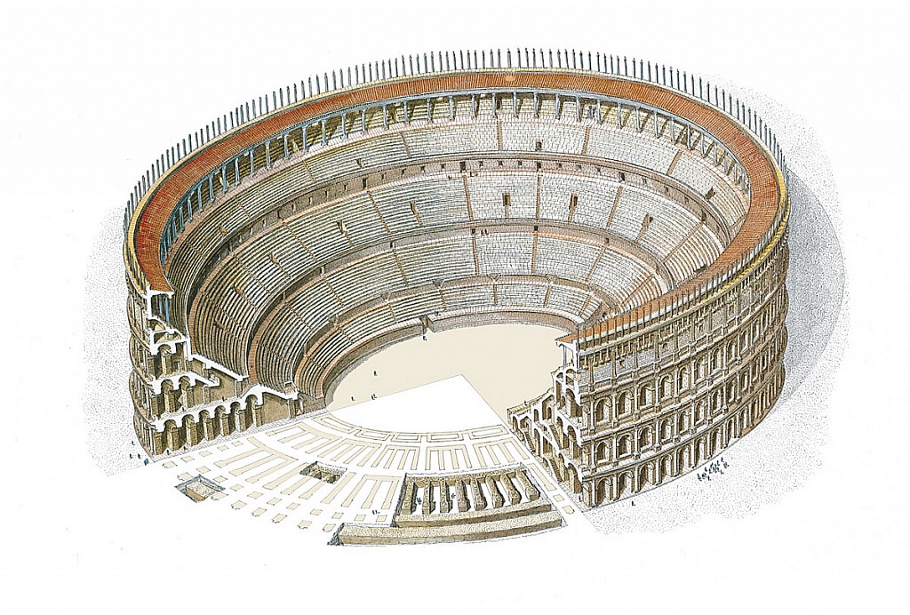 The amphitheatre, 155 meters long and 125 meters wide with an external wall 38 meters high, could host up to 20.000 people and Ausonio called it Voluptas populi,’ joy of the people’.