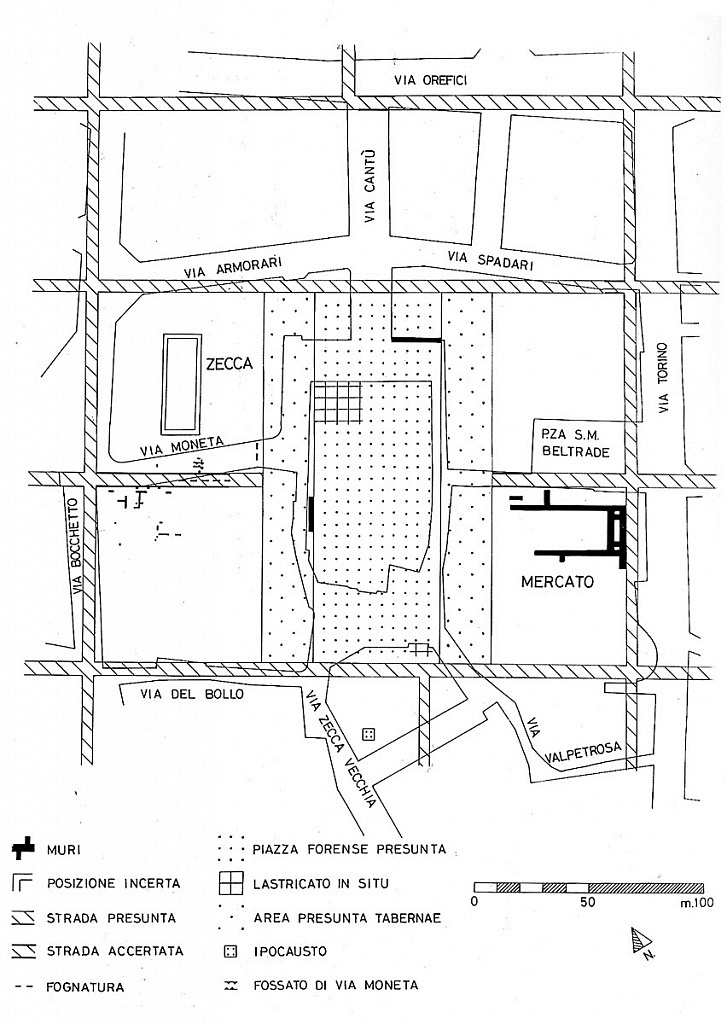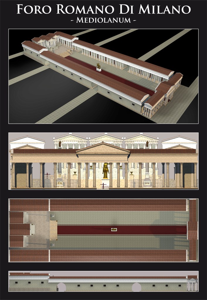 The forum of ancient Mediolanum was located at the intersection of the main road axes, in the area now occupied by the Ambrosiana Library and Art Gallery and the church of San Sepolcro, the Holy Sepulchre, on the square that is considered the birthplace of Fascism since Benito Mussolini the rally in 1919 in which he founded the ‘Fasci di combattimento’.