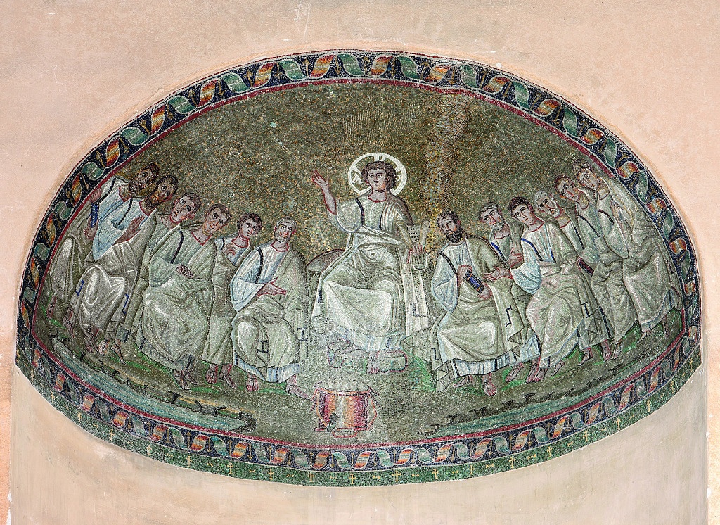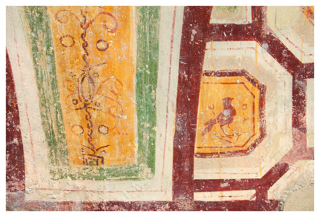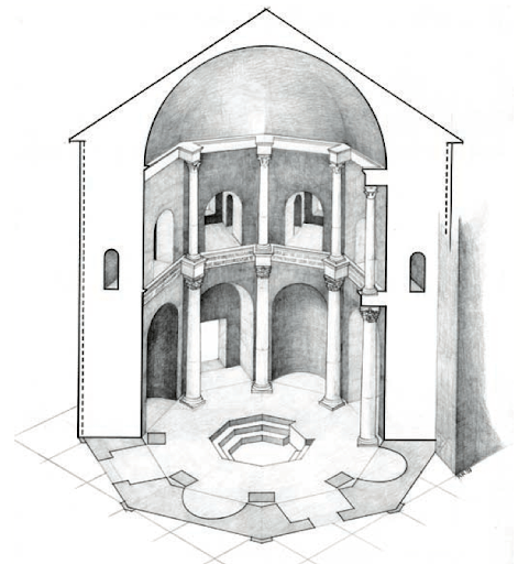 In the octagonal hall, the only surviving mosaics refer to two precious apse basins depicting Christ the magister among the apostles and Christ-Helios with the solar chariot. Very interesting is the choice to use Christian and pagan iconography