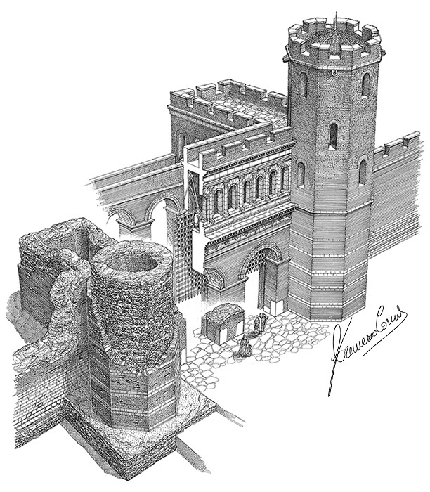 Nested at the junction with Via Medici, Porta Ticinensis reunited “the two sections of the Augustan and Maximian walls that had separated at the Vercellina gate to embrace the Circus”. At the time the Porta had a double fornix (opening) flanked by two massive towers of eight sides each.