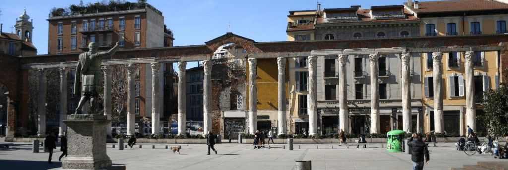 More than 8 million tourists visit Milan every year, attracted mainly by its art, its culture, its fashion and design, the Duomo and its other churches, or even a football ‘cathedral’ like the San Siro Stadium. Not many of these visitors, though, are aware that Milan was once the heart of Roman civilization: it was in fact the capital of the Roman Western Empire for more than a century, from 286 AD until 402. Ancient Romans called it Mediolanum, the ‘central place’ in the Po Valley (or maybe ‘half woolen’ from a boar that was its ancient symbol). The most remarkable legacy of the Imperial city are the Colonne di San Lorenzo in front of the Basilica di San Lorenzo Maggiore (Saint Lawrence Church), one of the oldest churches of Milan. We are near the medieval Ticinese Gate (Porta Ticinese), the southern exit toward the canals Navigli Grande and Pavese and the city of Pavia.