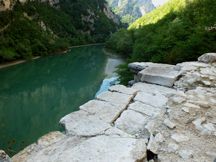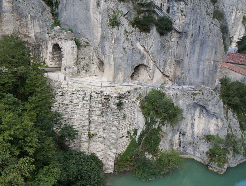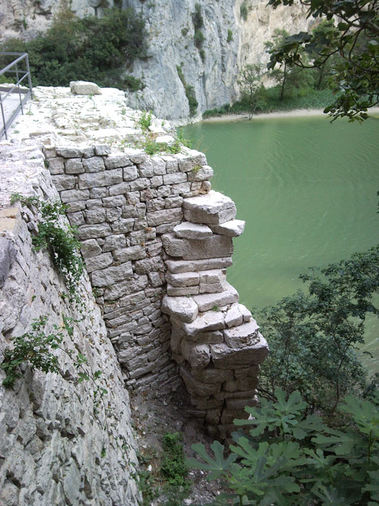 At Furlo the original route followed a path about 80 metres above the bottom of the gorge that was widened so that the road could pass outside the entire rock spur. This required “terracing” walls to support the road called substructures: they extended for a length of 20 meters and reached a maximum height of almost 30 meters, today partly submerged by water.