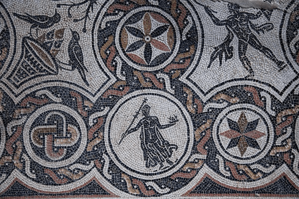The mosaic floors feature figures and scenes from classical mythology that give the name of the Domus. In the vestibule there is a wonderful representation of Neptune with the trident in his hand who, accompanied by his wife Amphitrite, launches the hippocampi that pull his chariot into a gallop, surrounded by darting dolphins.