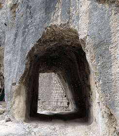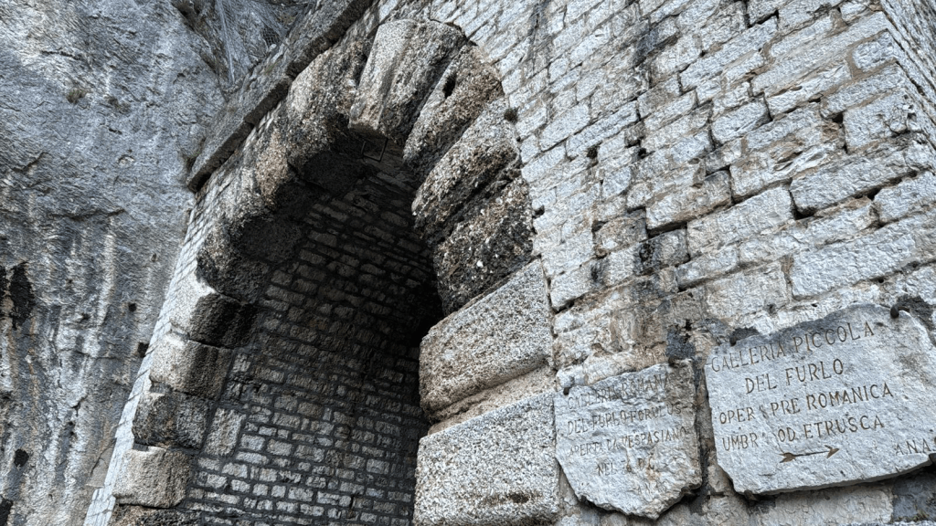 This small and perhaps precarious tunnel provided a narrow emergency passage for the Via Flaminia to bypass the steep side of the cliff that had previously collapsed. The tunnel has irregular chippings in connection with the two entrances, made with a chisel on the walls carefully cut vertically.