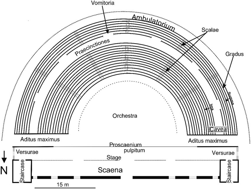 The cavea had a semicircular plan and three orders: Tuscan, Ionic and Corinthian, of which only the lower order is preserved, 25 arches on pillars with Tuscan (similar to the Doric order except that they are not fluted) semi-columns.