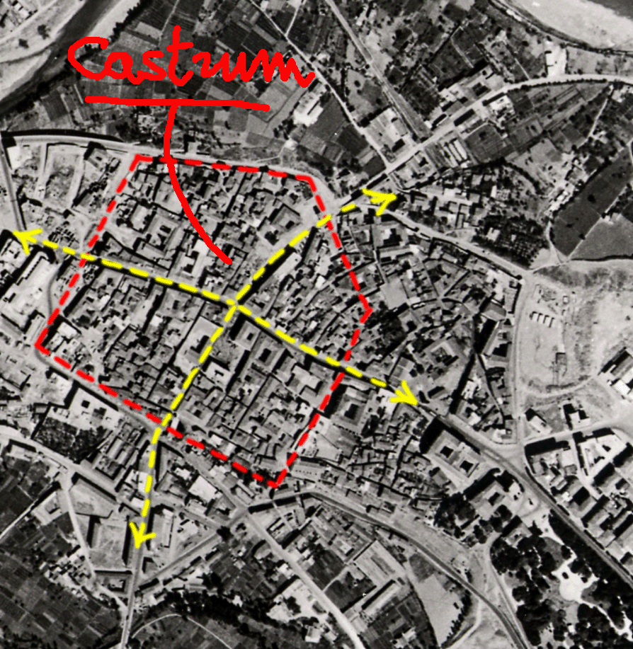 The original castrum (fortress) had a perimeter of about 2100 meters and a pentagonal layout that enclosed an area of almost 30 hectares, organized on the basis of 35-meter wide blocks.