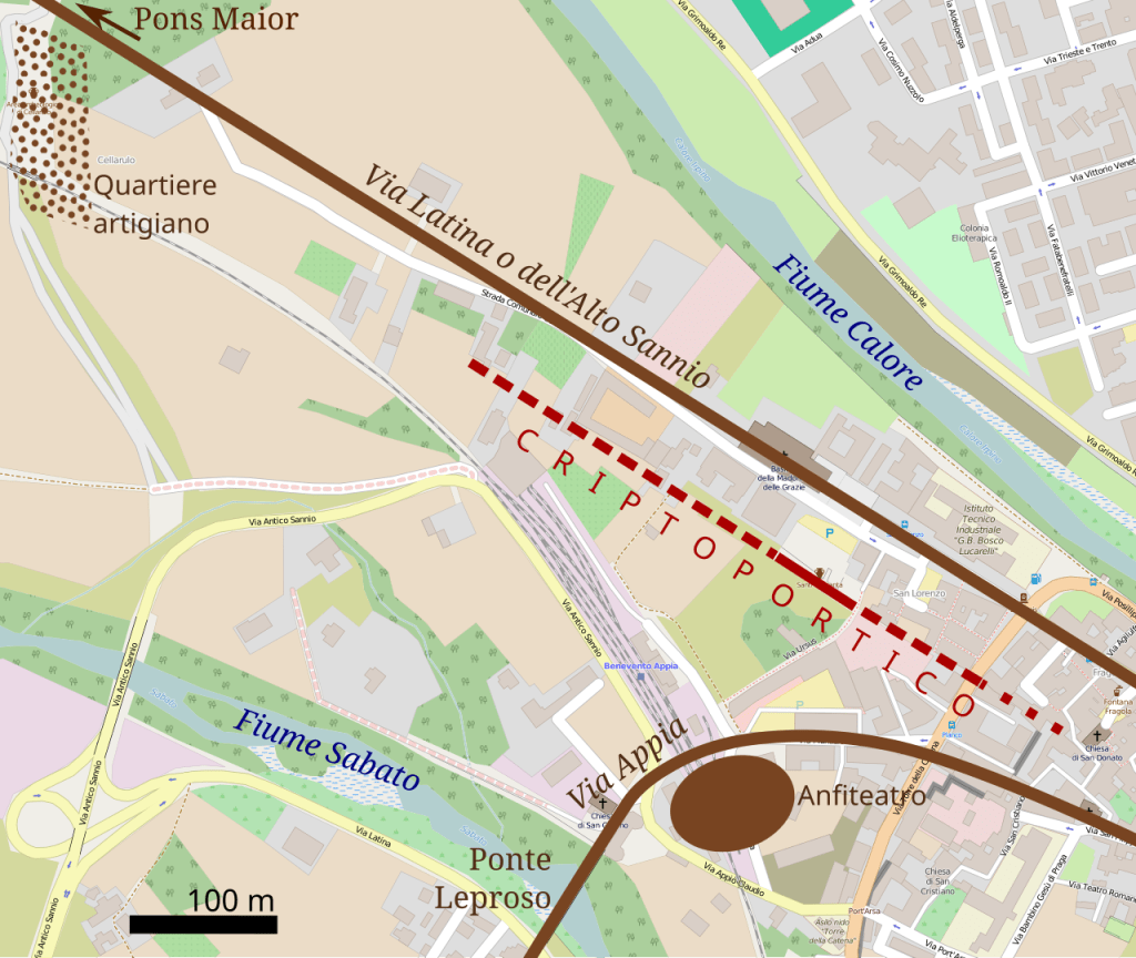 The Leproso bridge, with the typical humpback structure, allowed the Appian Way to cross the Sabato river, about 1 km south-west of Benevento. The name is probably a transformation of Ponte Lebbroso since a lazzaretto (hospital for lepers) may have been near it in the Middle Ages. The ancient name of the bridge was Ponte Marmoreo (Lapideo in the documents), as it was covered in travertine.
