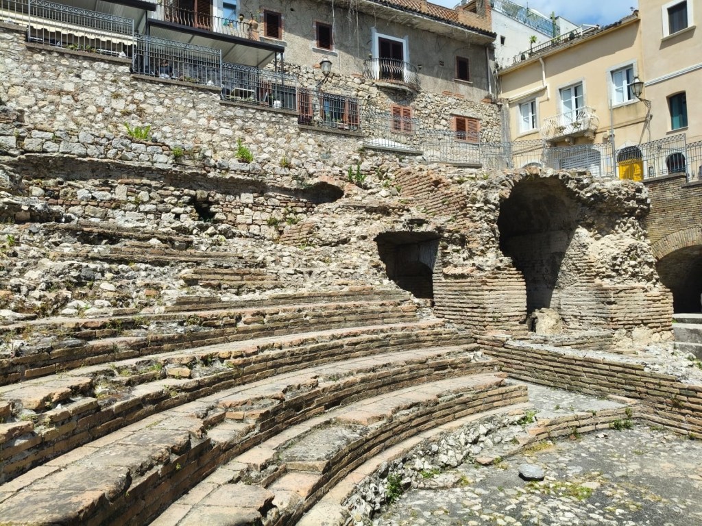 The cavea is divided into five sectors and is surmounted by a brick gallery. The Odeon was built on a Greek temple, now hidden by the Church of Santa Caterina (17th century).