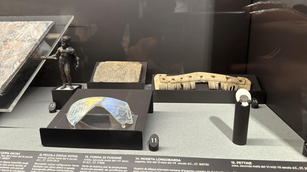 THE WINGED VICTORY – The real treasure is in the eastern cell: a marvelous Winged victory, a bronze masterpiece from the first century AD, restored in 2021 by the Opificio delle Pietre Dure in Florence. The museum setting was designed by Spanish architect Juan Navarro Baldeweg and it is conceived to make the bronze statue shine, highlighted by the monumental scenography.