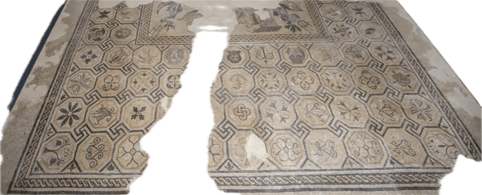 Inside, the original geometric coloured-marble pattern flooring (opus sectile) from the 1st century AD is still in place. Stone altars and fragments of cult statues and furnishings have been arranged inside the cells. On the walls of the central hall is a display of the collection of epigraphs.