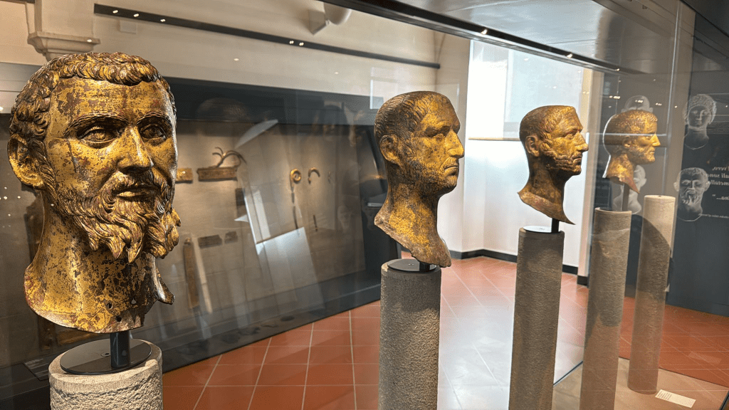 On display is a series of heads made of bronze using the technique of lost-wax casting and gilding only on the male ones, the portraits must have been inserted into stone or marble statues, as indicated by the careful finishing of the neck flaps. They were identified as members of the Flavian dynasty and emperors of the second and third centuries AD.