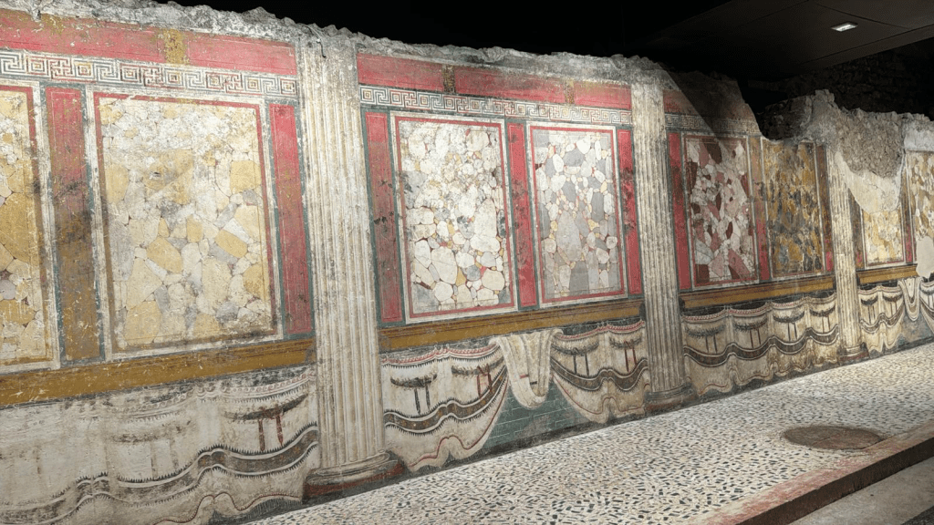 From the corridor we pass to three rooms decorated in a uniform style. On a white background, yellow or red vertical and horizontal lines have been drawn, dividing the surface into a series of panels. It is the so-called linear style that spread between the end of the 2nd and the beginning of the 3rd century AD.
