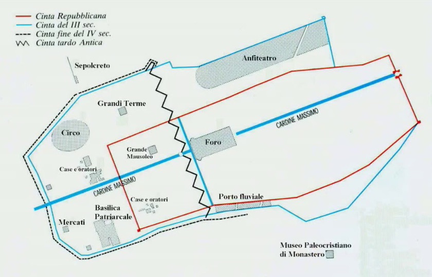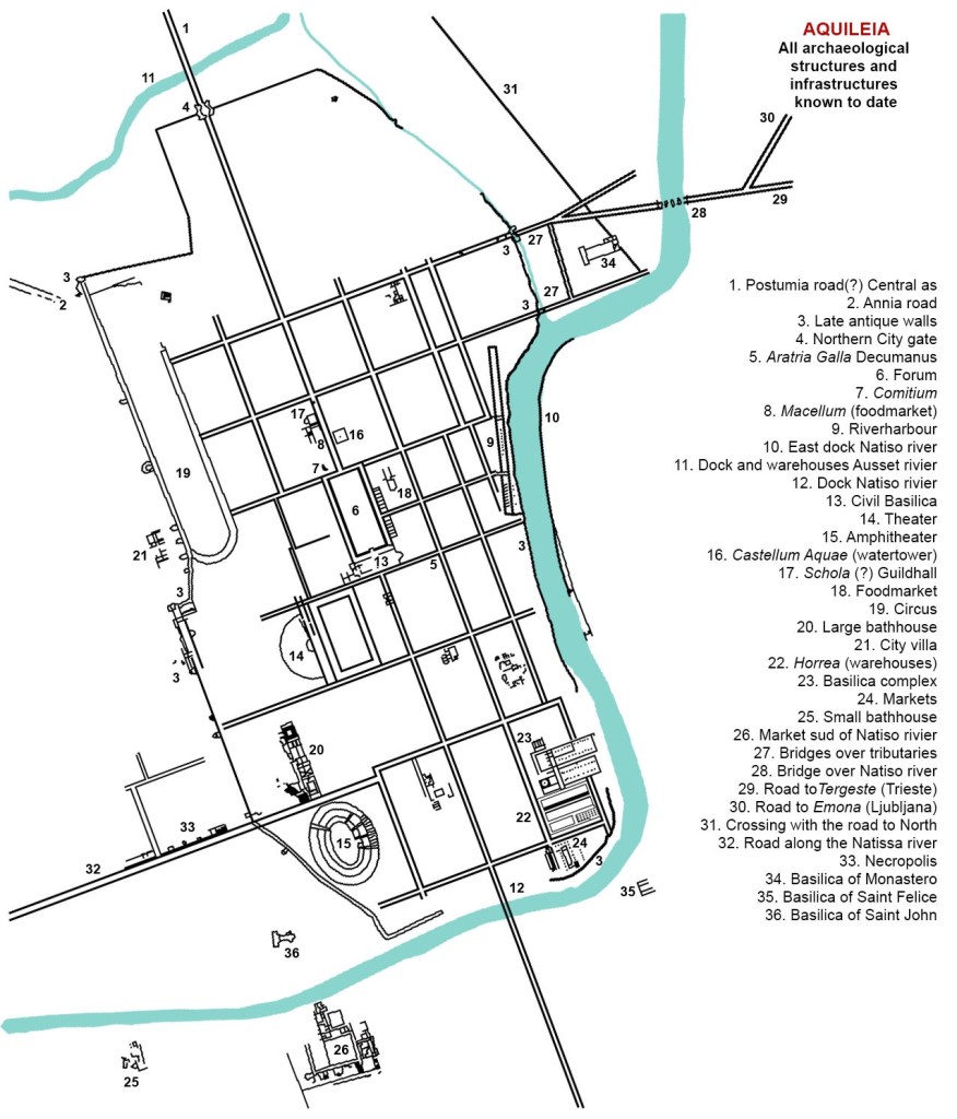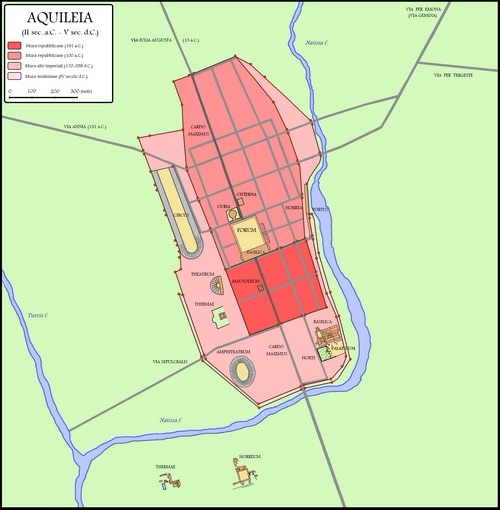 By sea, the port of Aquae Gradatae (San Canzian d’Isonzo) was developed. On land, Aquileia was the starting-point of several important roads leading outside Italy to the north-eastern portion of the empire.