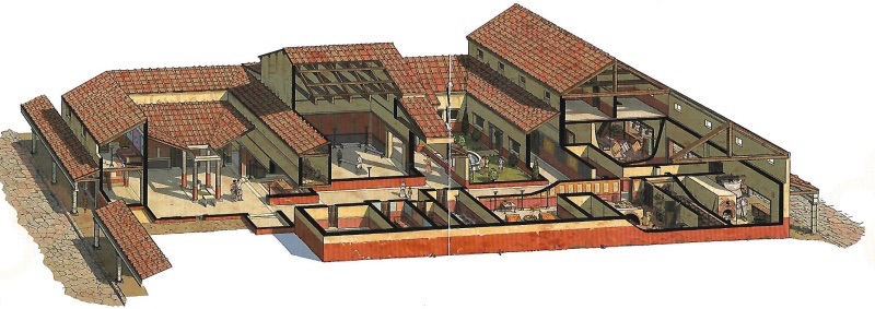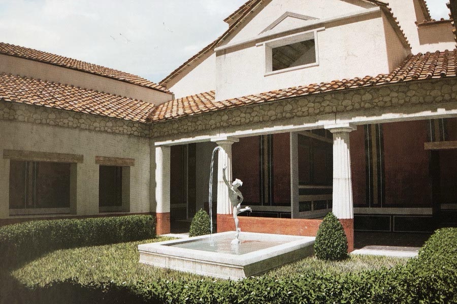 The house was accessed from the west through an atrium supported by four columns and featuring a central pool for collecting water and a well, partially preserved and integrated into the missing section.