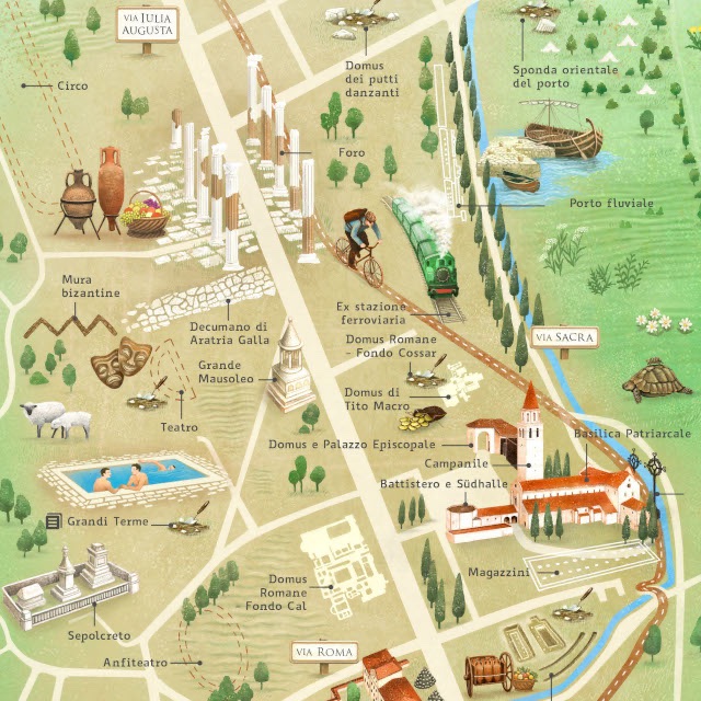 Aquileia today is an evocative site where scattered housing and fields cover the once-busy Roman urban streets. The ruined port is silent, and noticeboards explain how the local residents built frantic defences against Attila the Hun, erecting protective walls with any marbles and sculptures that came to hand.