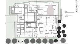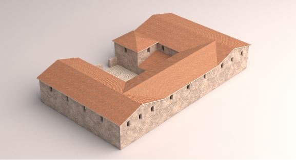 The complex is square in shape, with sides measuring 150 meters, and is composed of two interconnected sections: both contain porticoed rooms, corridors, and apses arranged around a courtyard made of sandstone slabs, square in the case of the northern section, rectangular in the other; it is possible that some of these rooms were used as storage rooms or offices.