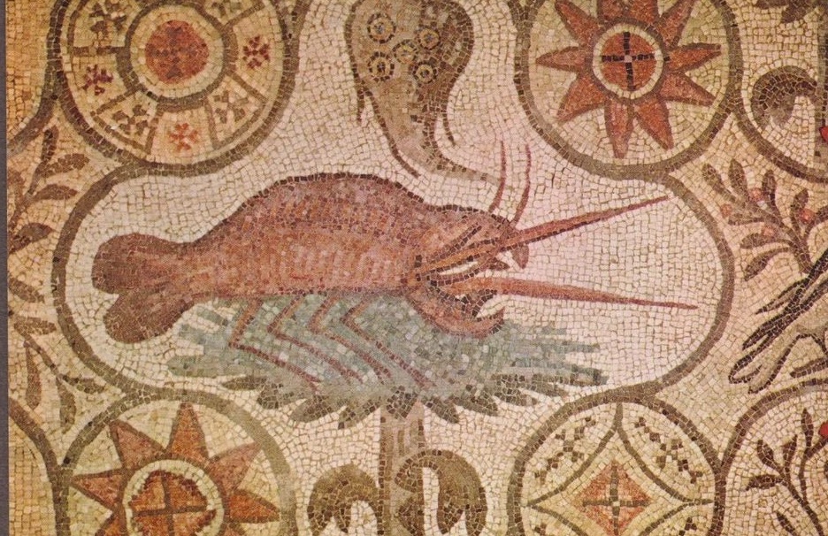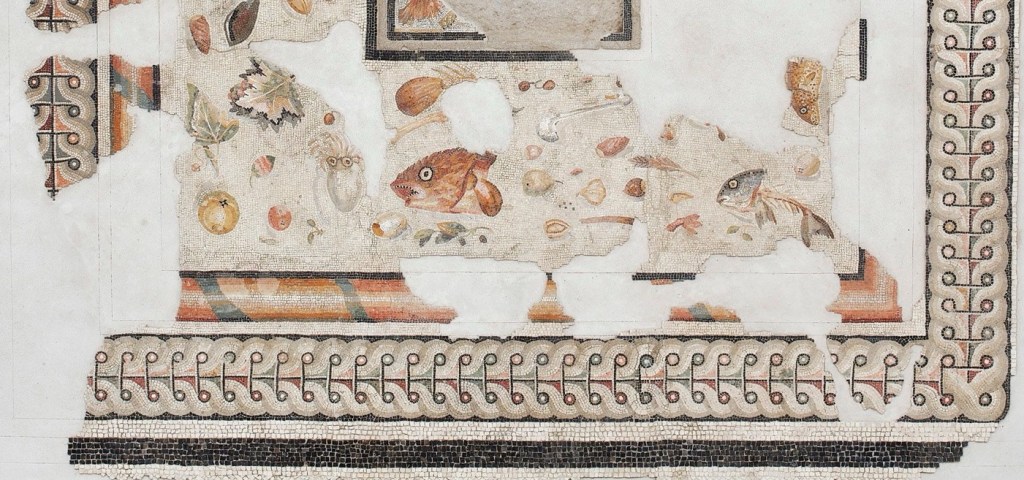 The models that inspired the three refined floors made of small tiles with bright colors come from the Greek-Eastern area: Europa on a sea bull, the remains of a sumptuous meal abandoned on an unswept floor and the mosaic with shoots joined in the center by a bow (see the picture at the beginning of this section) which embellished the triclinium of a house in the same neighborhood.