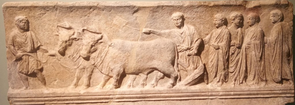 Take a look at the 183 BC limestone table of foundation of the colony of Aquileia: the pomerium, the ‘primitive furrow’ left by the plough pulled by an ox and a cow, marks the sacred perimeter of the city traced in front of the magistrates.