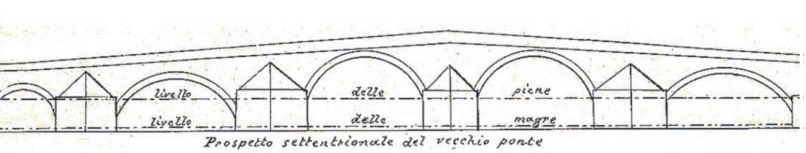 It is articulated in 5 round arches, supported by enormous pillars with pointed bases. Its central span was probably one of the longest among the bridges of the Roman age. A pathway was built in the cement during World War II so that tanks could pass by. The arch has undergone many restoration works over the centuries while the pillars, supports and foundation plateau have remained untouched.