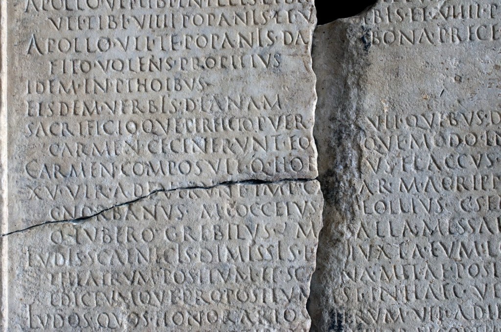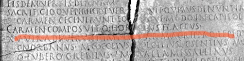 Horace’s name comes on line one hundred and forty nine. His poem, which is not itself in the inscription, is a hymn to Apollo, Augustus’s favoured god, to Diana and to the goddesses of childbirth in their various forms.