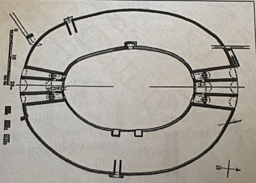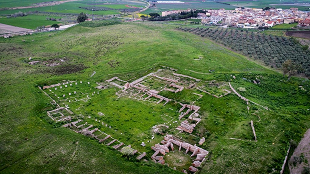 The ancient city has the shape of an elongated rectangle that ends in a point towards the north and is delimited by a wall 2 km long, partially still visible, which enclosed an area of almost 20 hectares of land. This rectangle, approximately 730 meters long and 300 meters wide, encloses a group of three hills very flat at the summit.